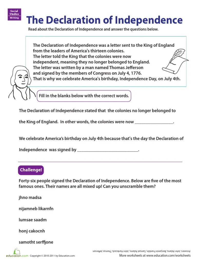 According to the declaration of independence, what should people do when the government abuses its power? This is a great worksheet for students that are just starting a unit on the american revolution or american governmen. People and places of the declaration of independence. After discussing the events that led to the writing of the declaration of independence, The members of congress signed the declaration of independence on july 4, 1776, declaring the united states an independent country. It is drafted simultaneously with the articles of confederation and the early state constitutions. Student worksheet answer the following questions using the declaration of independence. This worksheet incorporates the actual text of the declaration of independence into a worksheet that gets students to think critically about the founding ideals of the united states. As they learn about the declaration of independence, students will start thinking about civics and government. Worksheet • students will access america's library to learn about the roles that thomas jefferson, benjamin franklin and john adams played in writing the declaration of independence. Fill in the blanks using these famous names. But, here, the question is who was the writer of the declaration of independence? Independence day worksheet pdf happy independence day india happy independence day india happy independence day alphabet flashcards a collection of english esl worksheets for home learning online practice distance learning and english classes to teach …